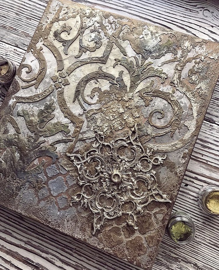 В прорези этого универсального инструмента удобно наносить краску различными способами: спонжем, круглой кистью или аэрографом. Трафарет легко вдавливается в глину, а также подходит для декоративной штукатурки. Для нанесения акриловых фактурных гелей наилучшим способом является использование шпателя, который также удобно использовать для удаления излишков краски без повреждения трафарета.